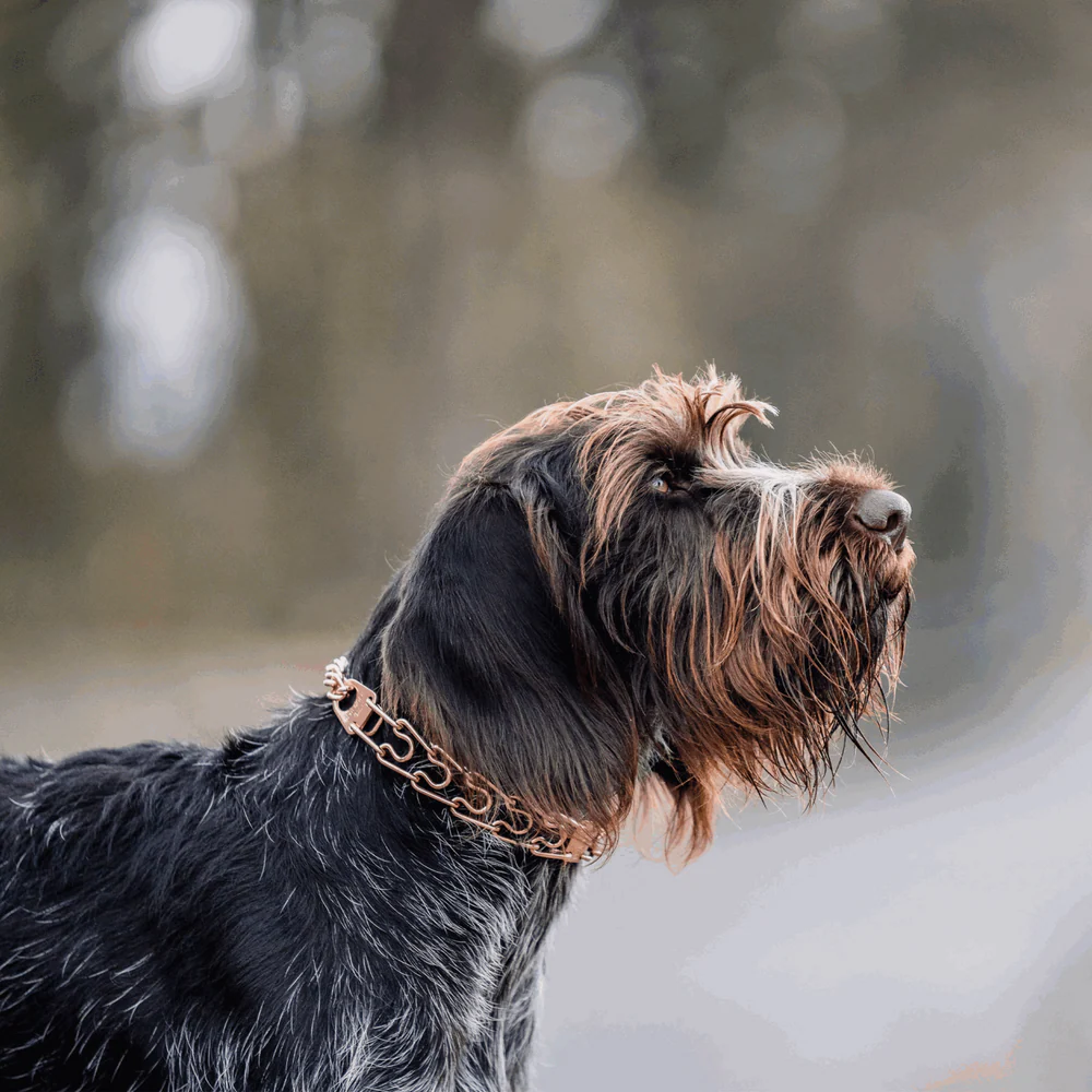 This training collar is made of curogan. It is a copper-tin-alloy with a high copper portion and some additives which make the material resistant to rust. There is no nickel, that is why these prongs avoid a discolouration of light-coated dogs. A further advantage of curogan is that it doesn’t provoke allergic reactions and skin rashes. So, it is recommended for dogs with sensitive skin. In addition, a high copper portion gives the collar a brilliant color. However, it antiques and darkens over time with regular use (the original look can be easily restored with the use of a polishing paste).